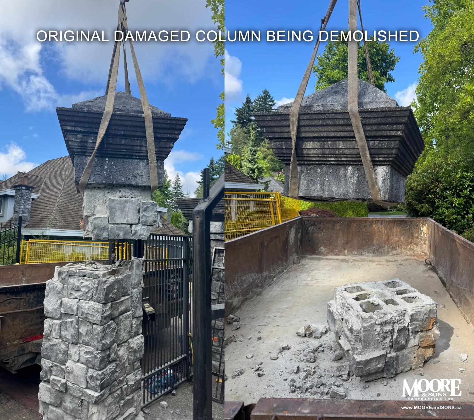 Original 30-year-old column, which was damaged by a dump truck, being demolished for rebuilding.