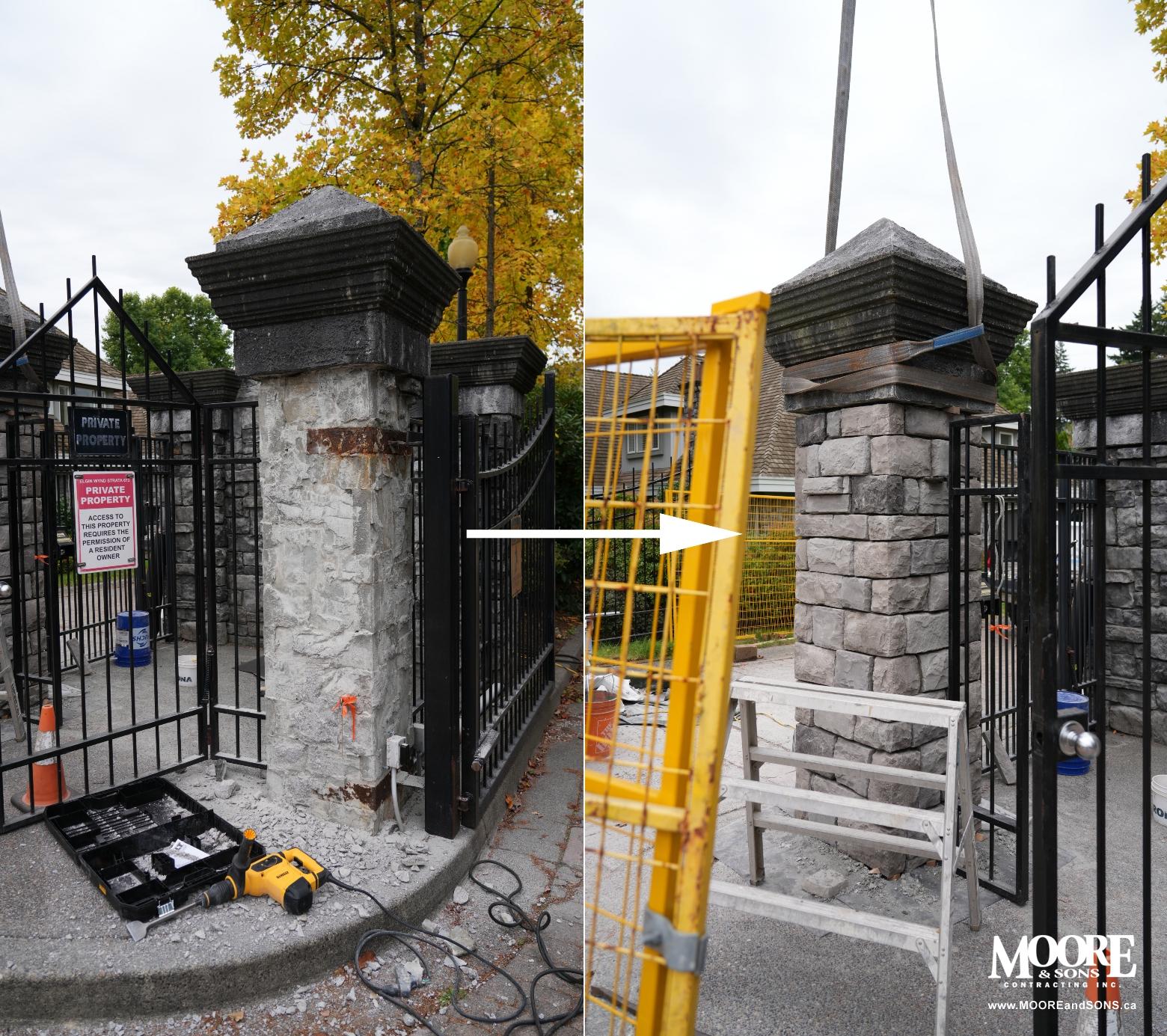 Damaged strata entrance concrete column demolishing and rebuilding in south Surrey.