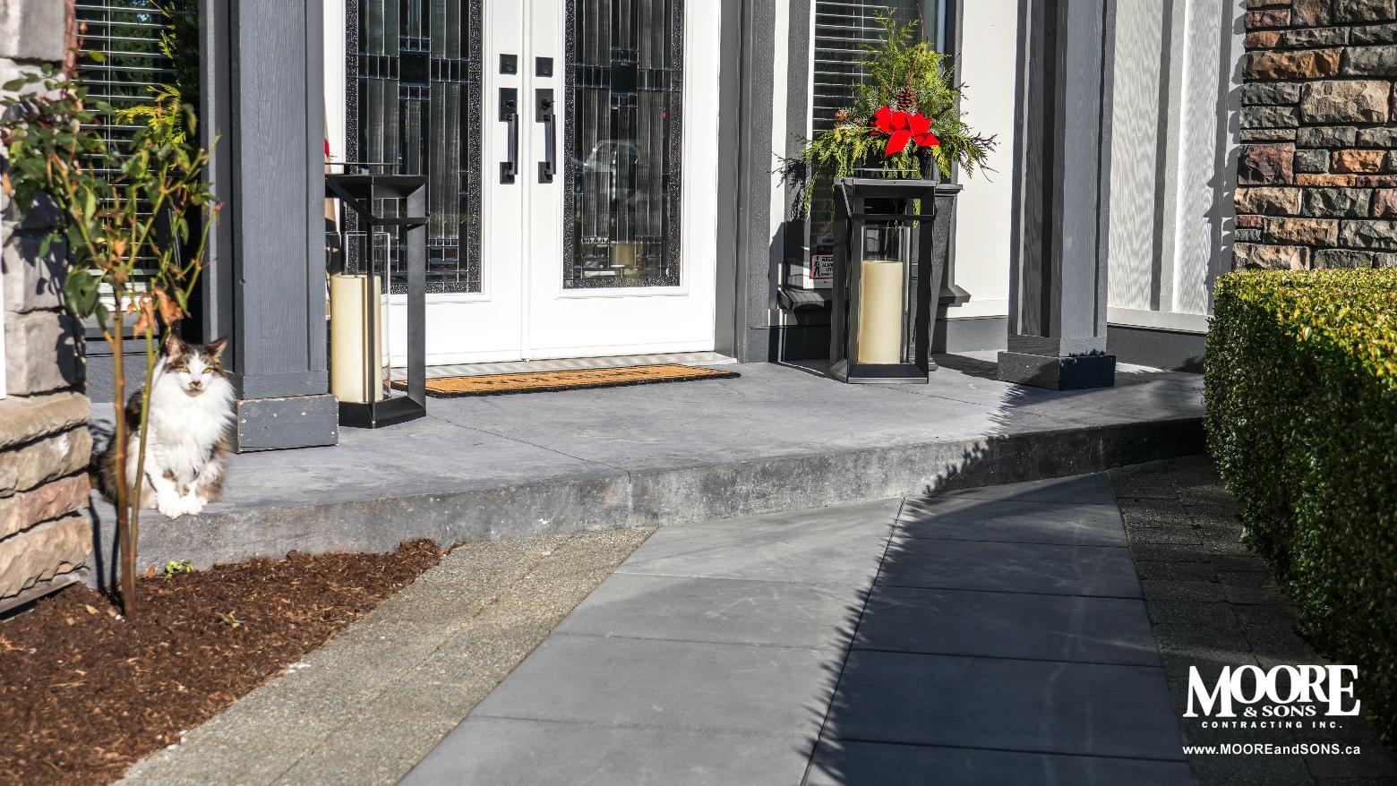 The project included a textured, stamped concrete front entrance paired with a new paver pathway, both finished in a rich charcoal tone. To keep the look cohesive, we also matched the side entrance landing and pathway to the front concrete, creating a seamless flow around the home.