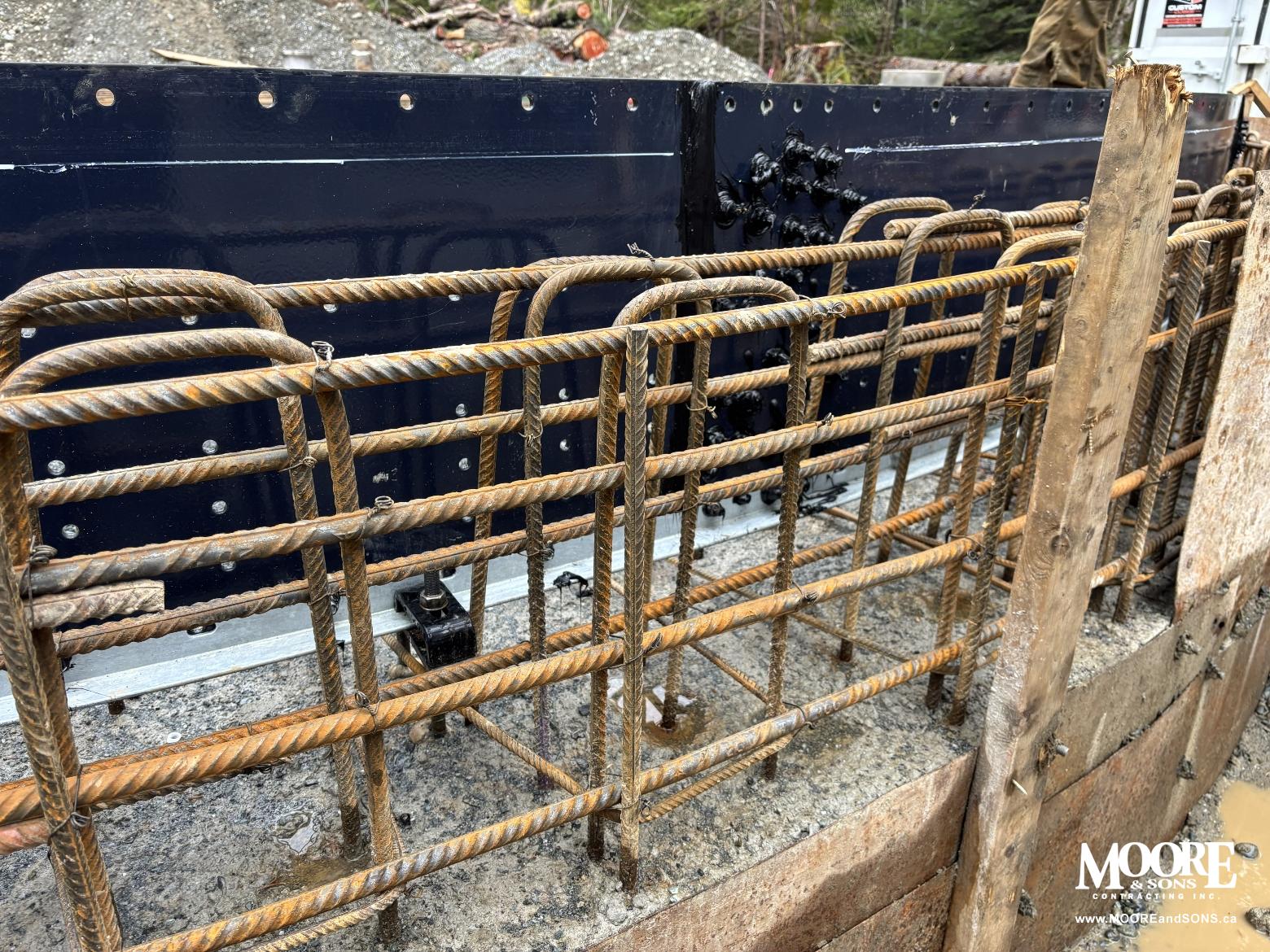 This project was another highly technical build, executed strictly to engineered specifications down to the finest detail. The 2-foot-thick grade beam was reinforced with 15M curved rebar and placed using 20 cubic metres of 25 MPa concrete. After the initial pour, the beam was protected overnight with insulated tarps to maintain proper curing temperatures in the chilly conditions.
